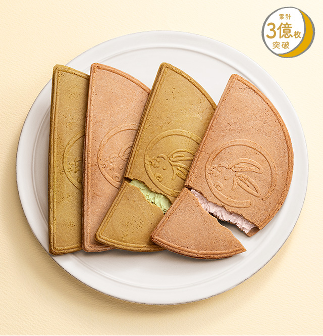 ほのかな甘さが上品な さくっとしたおせんべいにふわっと軽いクリームをはさんだ、昔ながらの半月です。